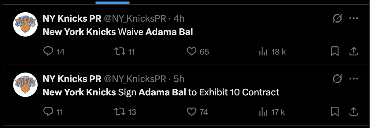 À 2h16 du matin, le compte X des New York Knicks a annoncé sa signature à un contrat Exhibit 10. Pour finalement officialiser sa résiliation 56 minutes plus tard, à 3h12 !