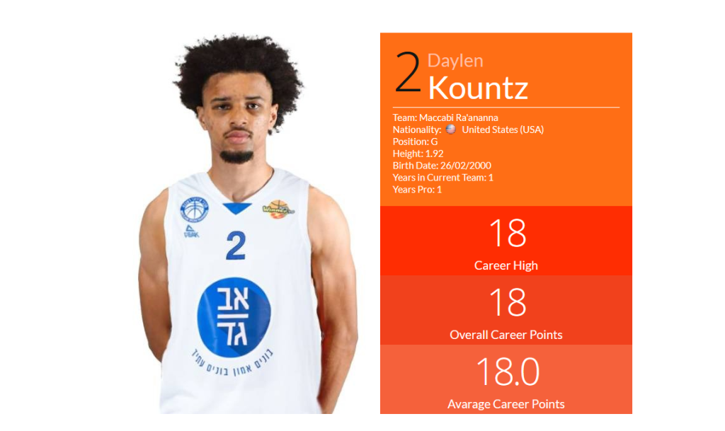 Pour sa première apparition, Daylen Kountz a signé une ligne statistique convaincante malgré la défaite de son équipe 96-107. Avec le deuxième plus gros temps de jeu de son effectif, il a cumulé 18 points, 2 rebonds, 4 passes et 3 interceptions, confirmant qu’il pourrait rapidement devenir une pièce importante du Maccabi Raanana.