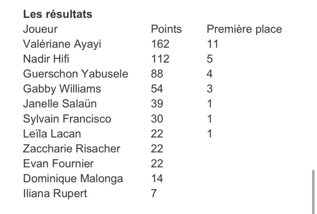 Gabby Williams, Janelle Salaün, Sylvain Francisco et Leïla Lacan ont aussi obtenu des votes pour la première place. À noter qu’il y a plus de femmes que d’hommes dans le classement final, au terme d’une saison notamment historique pour les Françaises en WNBA. À noter aussi que Victor Wembanyama n’a obtenu aucun vote, ce qui devrait devenir une exception à l’avenir…