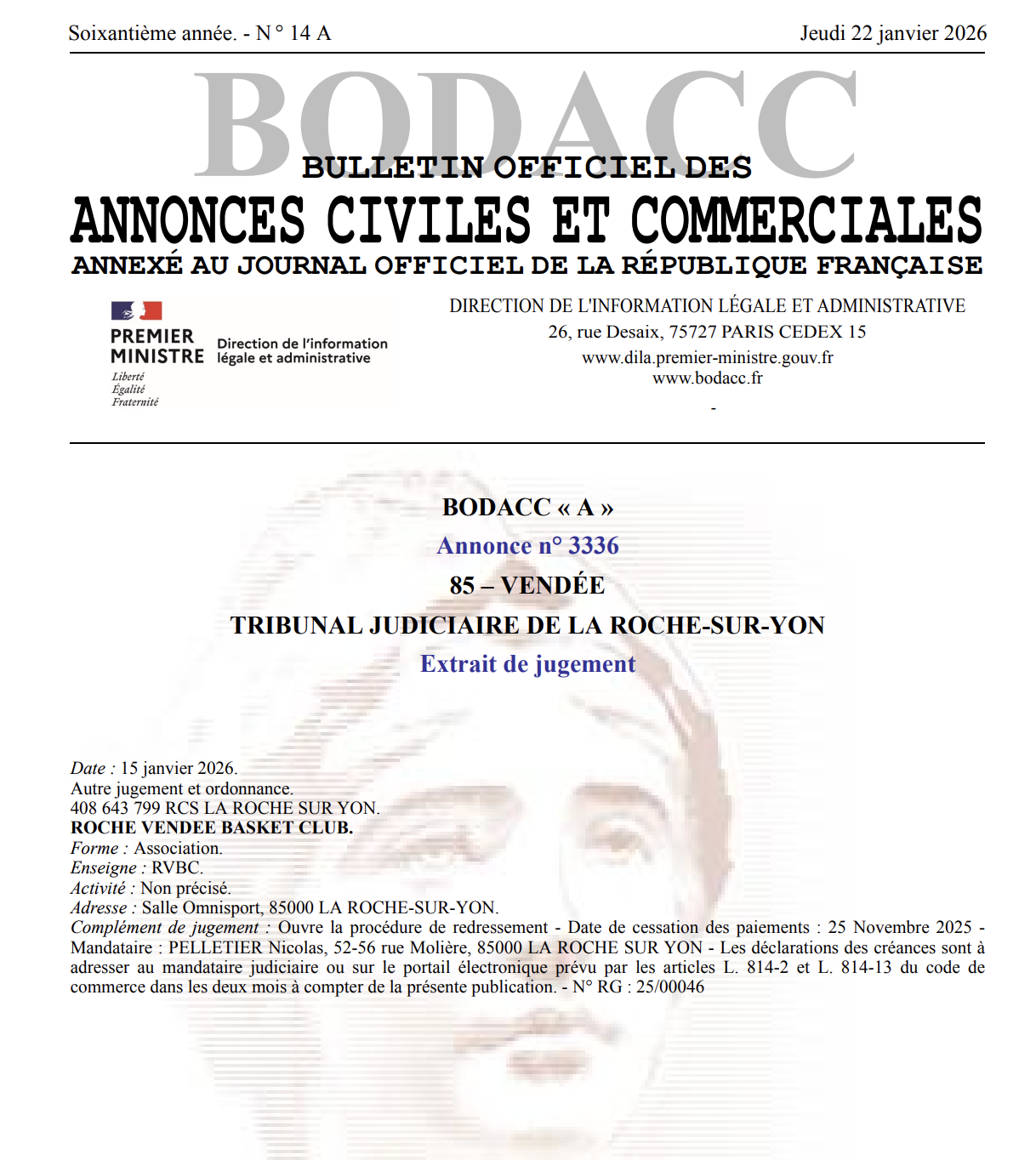 L’information a été dévoilée par L’Équipe, et il a suffi d’un petit tour sur le Bulletin Officiel des Annonces Civiles et Commerciales (BODACC) pour la confirmer : le club de La Roche Vendée placé en procédure de redressement judiciaire.