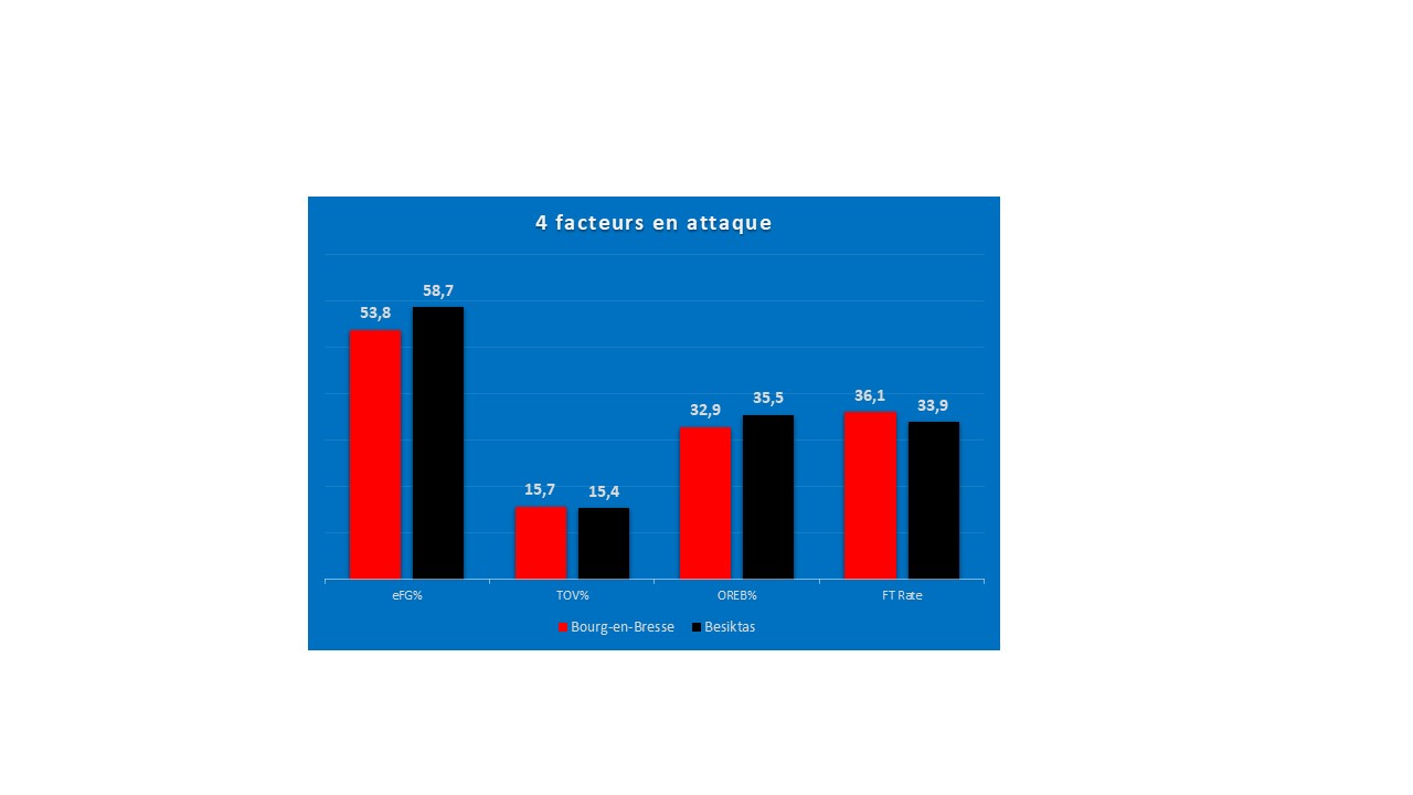 Comme évoqué précédemment, le Besiktas dispose de nombreuses armes offensives lui permettant de sanctionner à 3-points. Cela se traduit par le fait que c’est la deuxième équipe la plus adroite de la compétition dans ce secteur (39,4%). Mais c’est aussi l’équipe la plus en réussite à 2-points (58,4%). Grâce à ces hauts pourcentages de réussite au tir, l’effectif turc dispose de la meilleure réussite ajustée au tir (58,7% d’eFG%). Ainsi, les Bressans (53,8 d’eFG%, soit le 6e meilleur) n’ont pas l’avantage dans ce domaine notamment à cause de leur léger déficit de talent offensif.