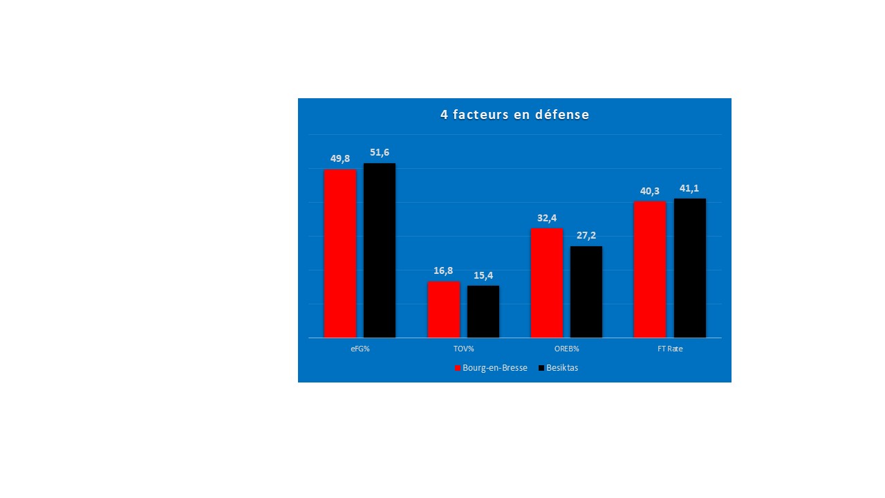 Les Bressans sont plus forts que les Stambouliotes pour réduire la réussite globale au tir de leurs adversaires dans le jeu et leur forcer des balles perdues. En effet, l’eFG% des adversaires des français est en moyenne de 49,8% (2e) contre 51,6% (6e) côté turc et 16,8% (5e) des possessions des adversaires de la JL se sont terminées par une balle perdue contre 15,4% (12e) pour les adversaires des turcs.