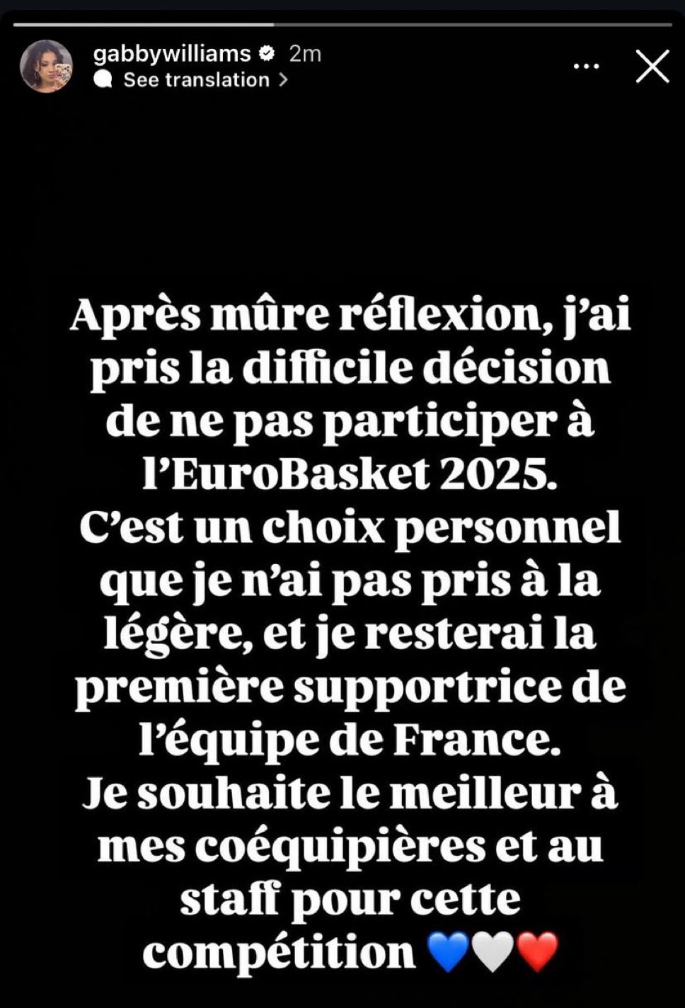 La confirmation ne s’est pas faite attendre. Quelques heures après les révélations de L’Équipe, Gabby Williams a officialisé son forfait pour l’EuroBasket 2025, prévu du 18 au 29 juin en Grèce.