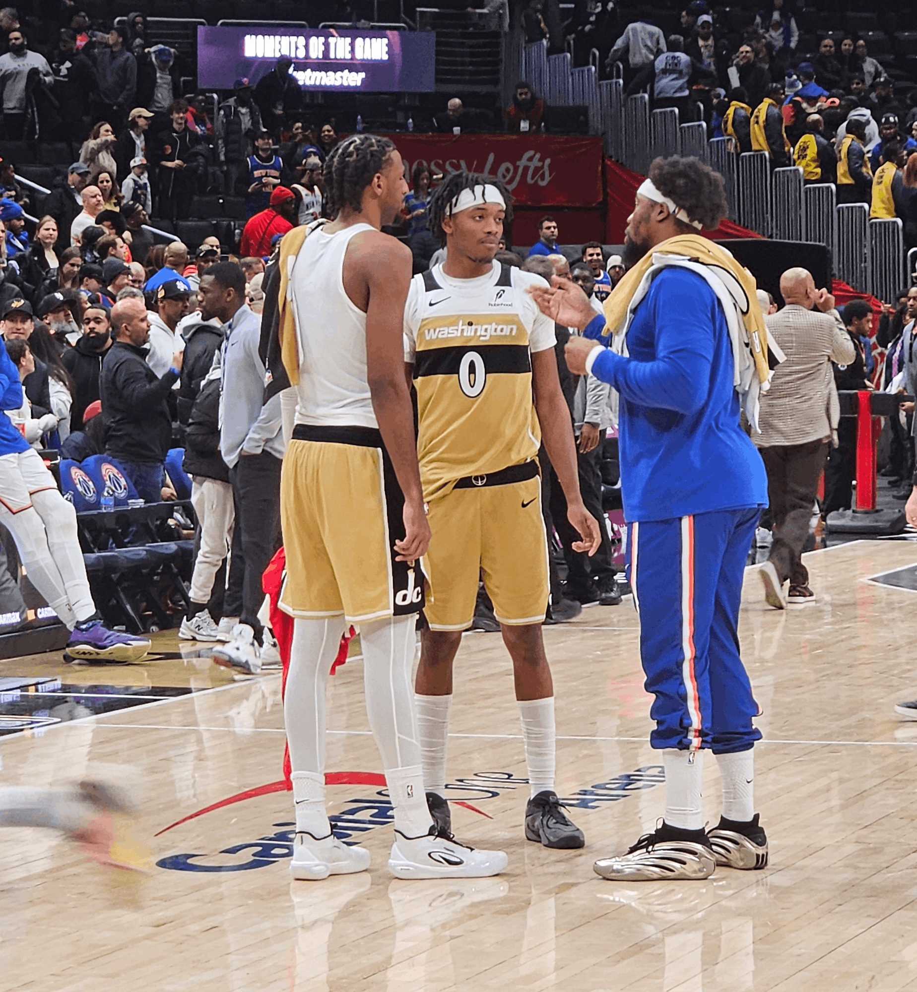 Mais pas de quoi entamer la bonne humeur de “l’ours dansant”, qui avait le sourire dans le vestiaire visiteurs de la Capital One Arena, et échangeait des blagues avec ses coéquipiers Ariel Hukporti, Mikal Bridges ou Karl-Anthony Towns. C’est avec cette attitude qu’il s’est présenté à notre micro pour une interview exclusive en français à BeBasket. L’occasion de parler des sujets sensibles forcément, mais aussi de sa relation avec ses coéquipiers Mohamed Diawara et Pacôme Dadiet, ainsi que ses adversaires du soir Alexandre Sarr, Bilal Coulibaly et Tristan Vukcevic.