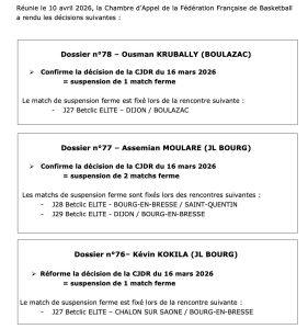 Du côté du promu périgourdin, l’intérieur américano-gambien Ousman Krubally voit sa suspension d’un match ferme confirmée. Malgré l’appel interjeté par son club, l’instance fédérale n’a pas revu sa position. Cette sanction sera effective lors de la 29e journée de championnat, privant ainsi le BBD de son pivot titulaire pour le périlleux déplacement à Dijon, prévu le vendredi 17 avril prochain.