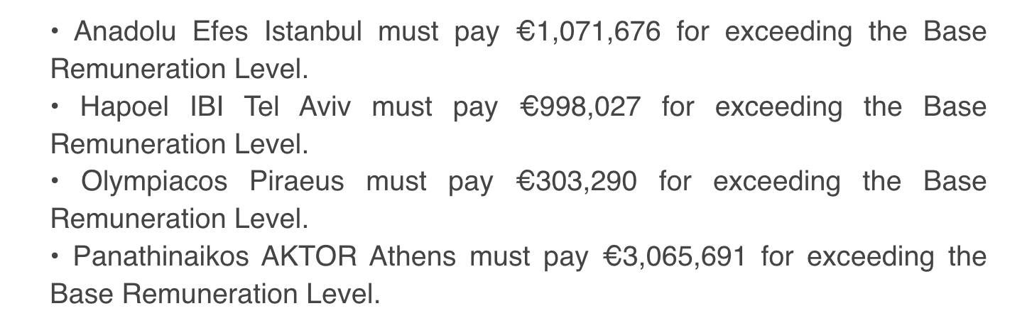 Le Panathinaïkos, habitué aux sanctions écope de l’amende la plus lourde : 3,065 millions d’euros d’amende, pour un dépassement estimé à 6,185 millions d’euros. Derrière, l’Anadolu Efes (1,07 million d’euros), l’Hapoel Tel Aviv (1 million d’euros) et Olympiacos (300 000 euros pour un dépassement de 600 000 euros) complètent le tableau des clubs sanctionnés.