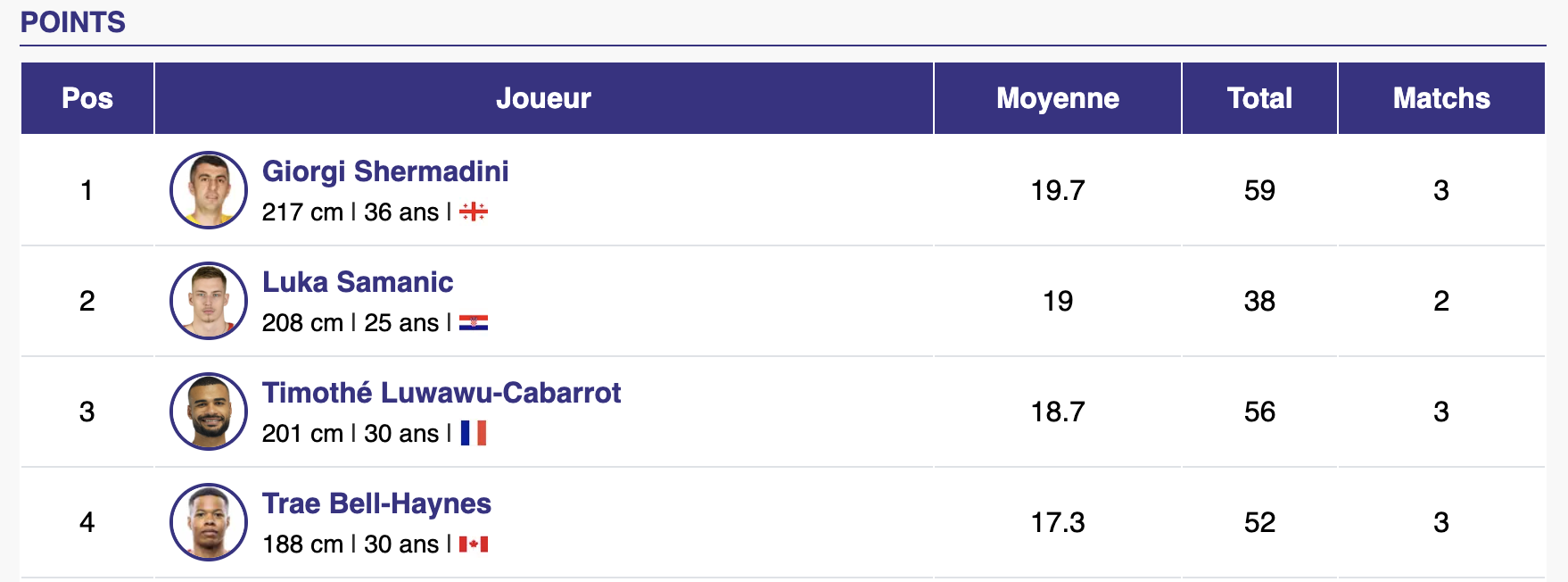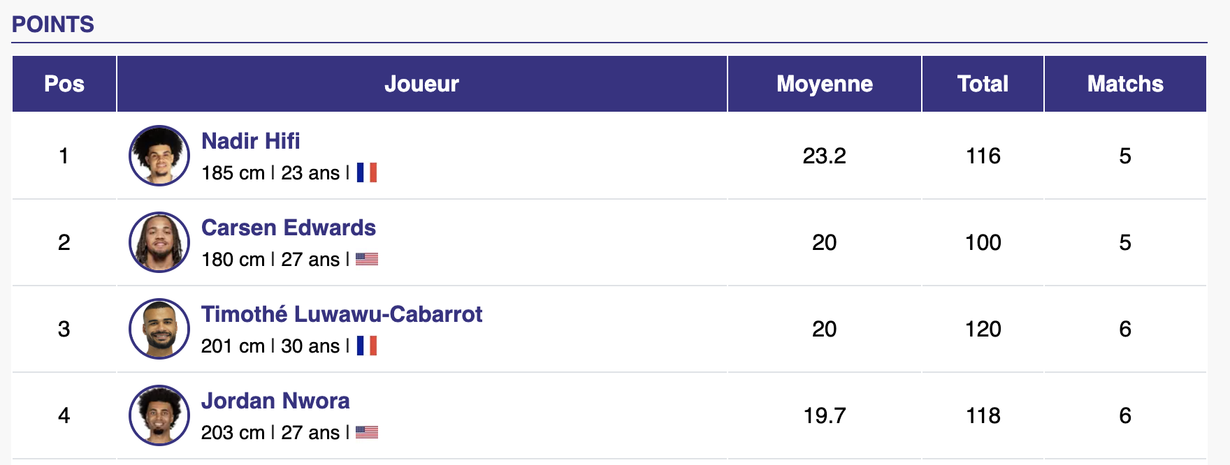 En tête, l’artificier Nadir Hifi, qui a encore pris une autre dimension avec le Paris Basketball depuis le départ de T.J. Shorts (23,2 points). Et derrière lui, à égalité avec Carsen Edwards, son coéquipier bleu Timothé Luwawu-Cabarrot, qui enchaîne les cartons dans le vide à Baskonia.
