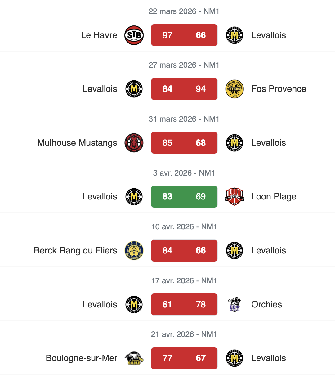 L’identité des quatre futurs relégués se dessine de plus en plus : Metz, pour qui la sentence est déjà officielle, Chartres, Poissy et Vitré, malgré une large victoire contre le SCABB Lab (91-72) et un bilan positif (11v-10d). Mais l’Aurore payerait au prix fort les six points de pénalité cumulés infligés par la FFBB…