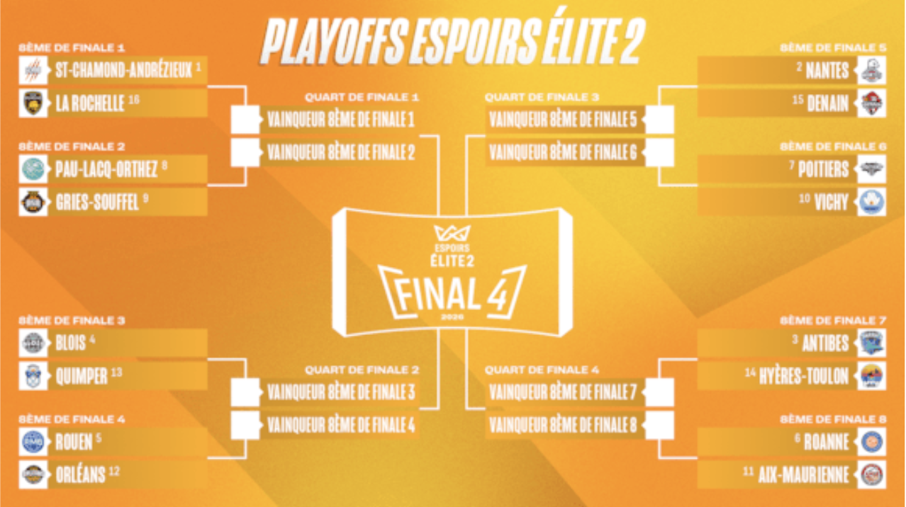 Les playoffs d’ÉLITE 2 se concluront par le Final Four les 16 et 17 mai à la Halle André-Vacheresse de Roanne.