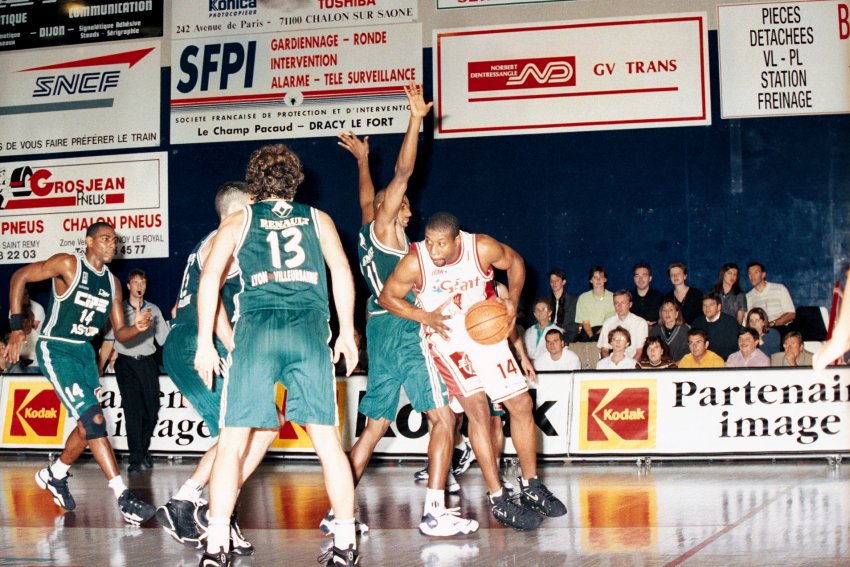Même si Villeurbanne avait effectué le court déplacement jusqu’en Saône-et-Loire sans sa star de l’époque, le légendaire Delaney Rudd, l’affiche restait déséquilibrée sur le papier. Le club bourguignon ne vivait que sa deuxième saison dans l’élite tandis que l’ASVEL avait participé au Final Four de l’EuroLeague la même année ! De fait, c’est bien une équipe de top niveau européenne qui s’est présentée à la Maison des Sports. Sur un nuage toute la soirée, les hommes de Gregor Beugnot ont joué comme dans un rêve. Avec une preuve que le basket a bien changé au cours des 22 dernières années : avec une telle adresse en 2020, les Rhôdaniens auraient sûrement tenté plus d’une vingtaine de tirs primés. Mais ils se sont contentés de cinq shoots derrière la ligne des 6,25 mètres, tous réussis (3 pour Alain Digbeu, 1 pour Georgy Adams et 1 pour Frédéric Miguel). Inversement, l’Élan n’arrivait à rien (13/43 aux tirs et 22 balles perdues). En dehors de David Robinson, auteur de 16 points, seul Kent Hill a terminé avec une évaluation positive : 3. Pire, les sept autres joueurs ont cumulé un terrible -11 d’évaluation (la feuille de statistiques est disponible ici). Sauf que paradoxalement, et vous le comprendrez à la lecture de cet article, ce match-là ne constitue pas un traumatisme pour l’Élan Chalon.