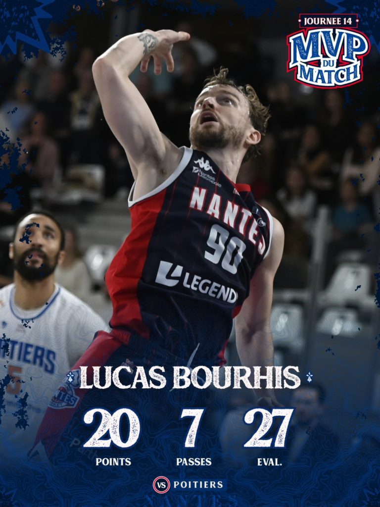 Ce coup d’éclat n’est pas un hasard. Depuis le début de la saison, Lucas Bourhis est un élément central de l’effectif nantais. Sur l’ensemble des 14 matchs de championnat, l’ancien joueur de Fos-sur-Mer affiche des moyennes solides, symboles de son impact régulier : 9,3 points, 1,9 rebond et 5,2 passes décisives pour 10,5 d’évaluation en 27 minutes de jeu.