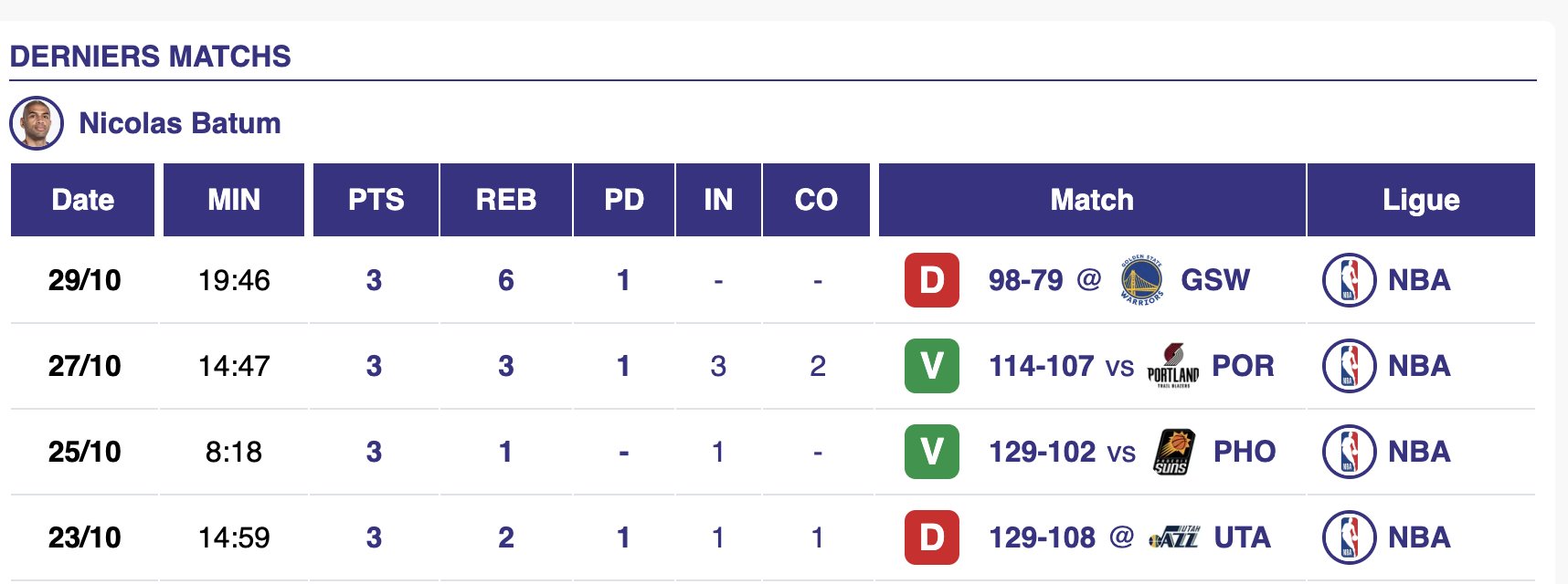 Dans la triste défaite des Clippers à Golden State (79-98), Nicolas Batum a individuellement connu une soirée comme toutes les précédentes, avec de nouveau 3 points au compteur. Quatre matchs joués, et quatre fois 3 points pour le Normand ! La moyenne est facile à faire.