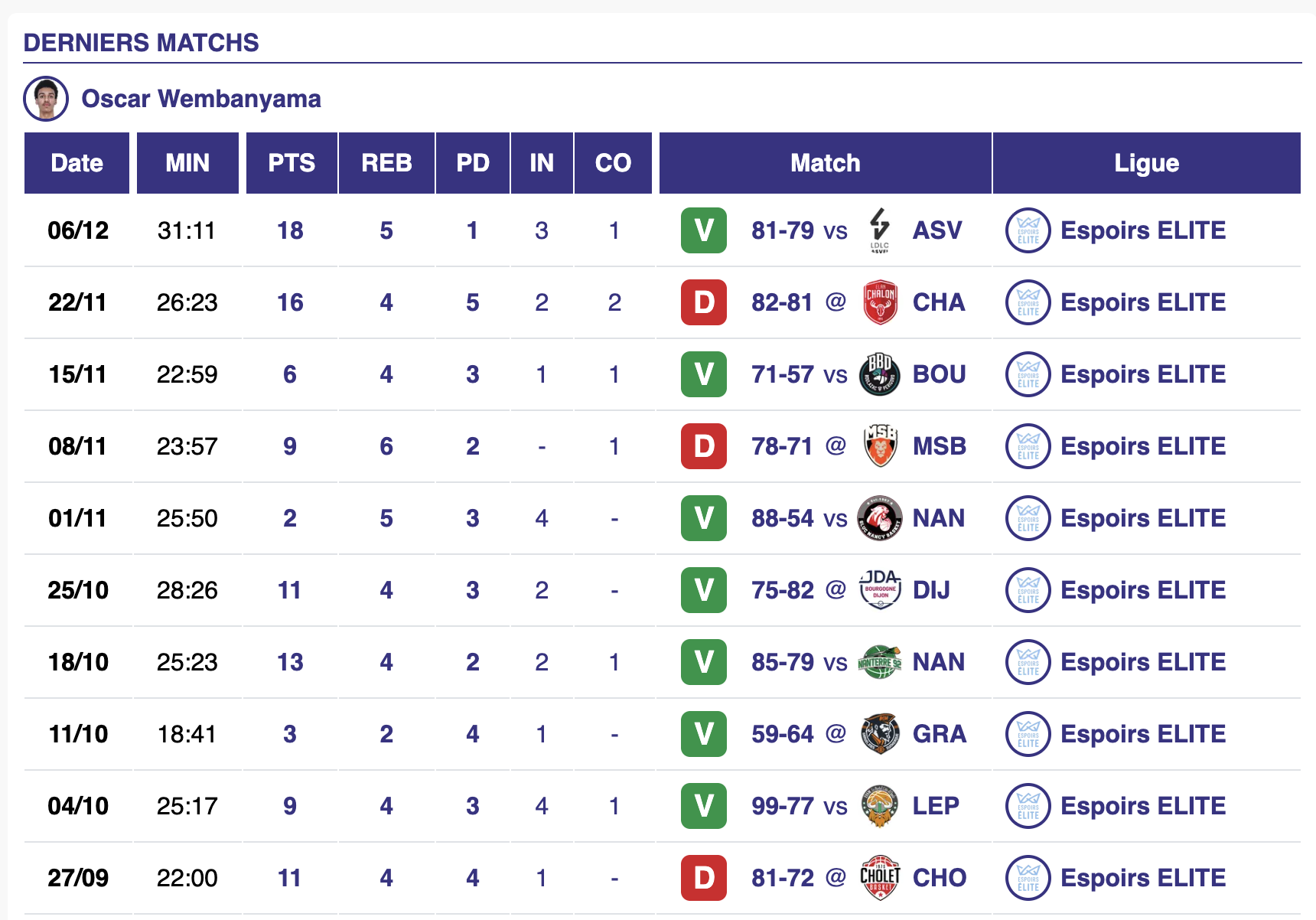 Bloqué l’an dernier à seulement cinq rencontres en Espoirs, sur la touche lors de tout le premier semestre 2025 en raison de problèmes médicaux, Oscar Wembanyama vit actuellement sa première vraie série de matchs à ce niveau. Intégré aux entraînements de Janis Gailitis, il a enchaîné les dix premières rencontres U21 et monte en puissance (9,8 points à 54%, 4,2 rebonds, 3 passes décisives et 2 interceptions de moyenne).