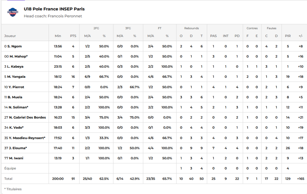 Messi Yangala (2,05 m, 16 ans) a terminé meilleur marqueur du match avec 16 points, confirmant son rôle de leader offensif. À ses côtés, Nateo Gabriel des Bordes a également pesé avec 15 points, dont un tir primé dans le troisième quart-temps qui a définitivement assommé les Israéliens.