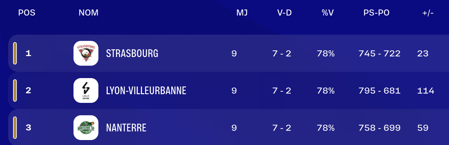 Un bilan qu’elle partage avec l’ASVEL et Nanterre, à la différence qu’elle possède le le plus faible différentiel des trois co-leaders (+23, contre +59 pour Nanterre et +114 pour Villeurbanne). Alors pourquoi est-ce elle qui figure à la première place lors de cette première trêve internationale ?