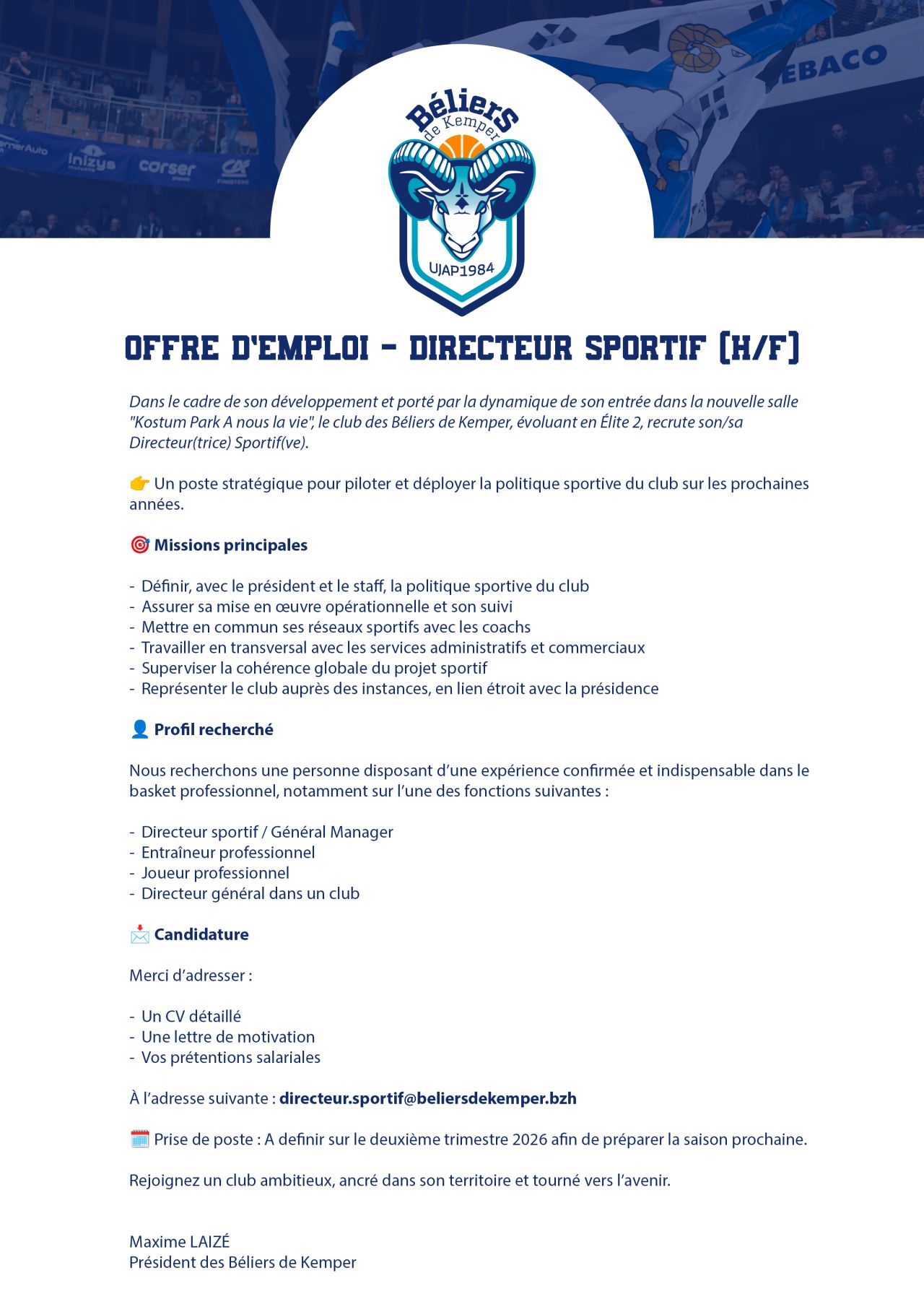 On peut donc y lire que le club breton recherche la perte capable de « piloter et déployer sa politique sportive sur les prochaines années ». Y sont énoncées les missions principales attendues, classiques d’un directeur sportif, et le profil désiré : celui d’une personne issue du monde du basket, que ce soit comme directeur sportif, entraîneur, joueur ou directeur général.