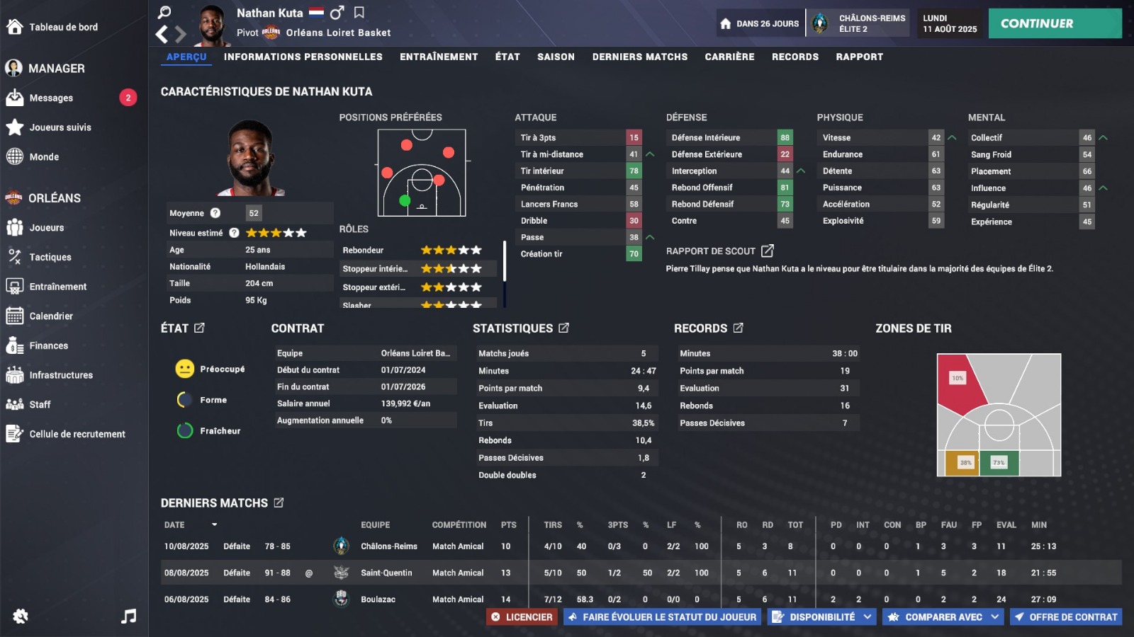 Avec 7,1 rebonds par match en seulement 25 minutes, Nathan Kuta (2,05 m, 25 ans) s’impose comme un pilier du leader actuel d’ELITE 2 avec Orléans. Dans Pro Basketball Manager 2026, son profil est idéal pour un collectif structuré : activité constante, fiabilité au rebond et capacité à s’intégrer sans monopoliser le ballon. C’est le type d’intérieur qui fait gagner sans forcément faire de bruit, mais dont l’impact se ressent sur toute la saison.