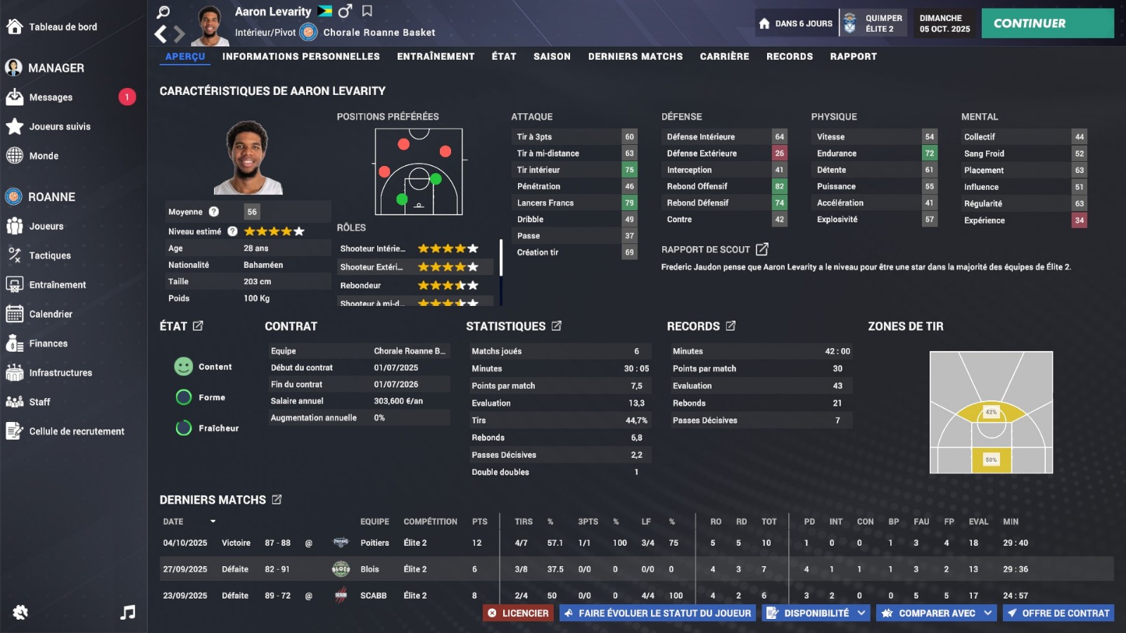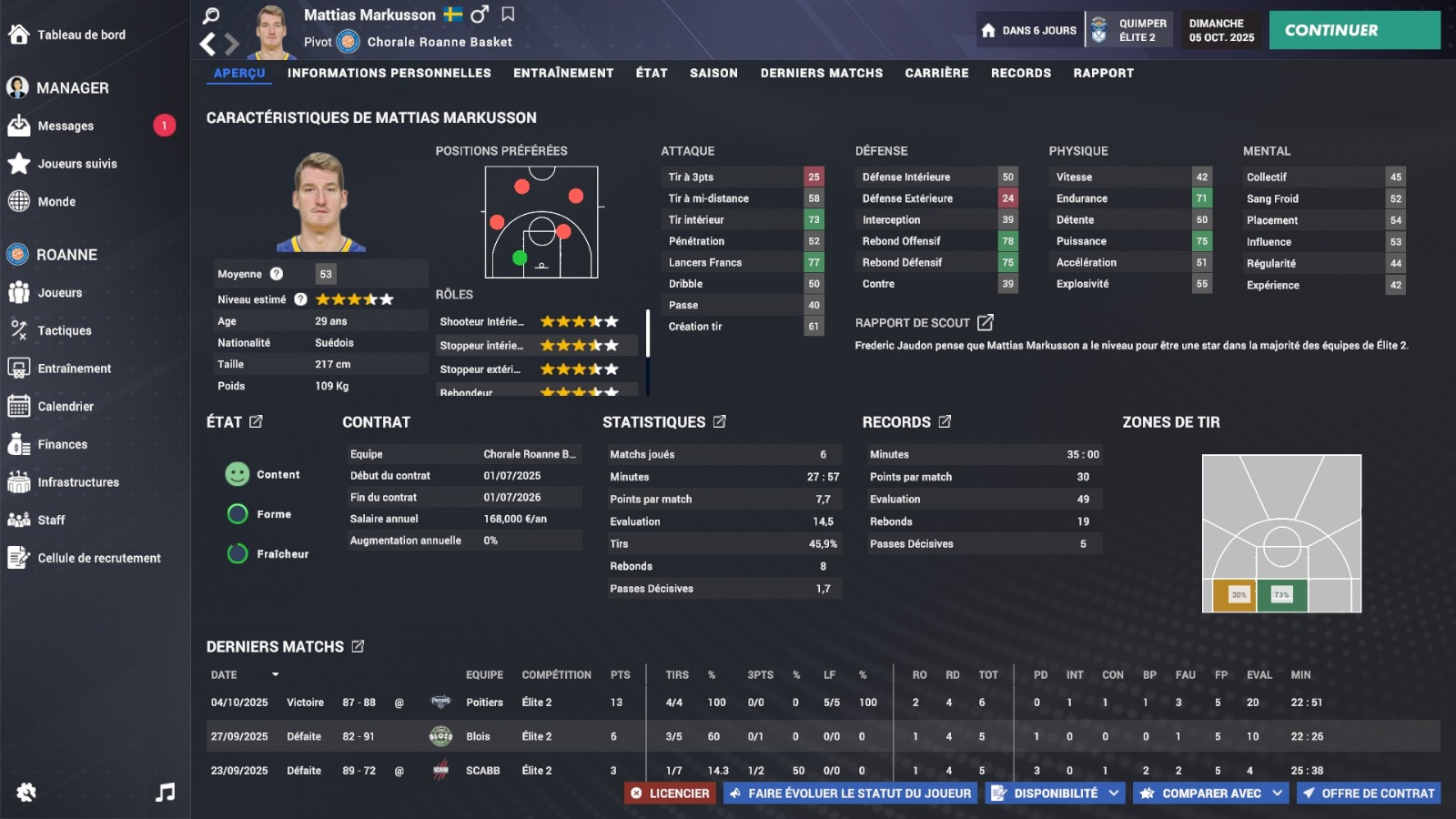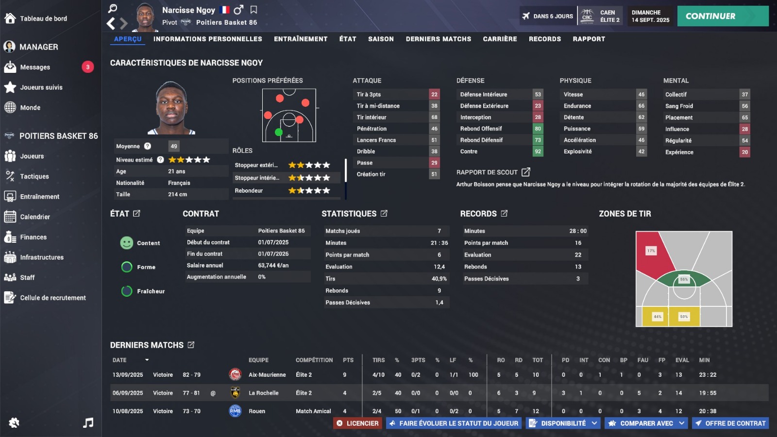 Meilleur rebondeur d’ELITE 2, Narcisse Ngoy (2,14 m, 21 ans) est une référence dans Pro Basketball Manager 2026. Capable d’avaler les rebonds défensifs comme offensifs, il apporte une vraie sécurité intérieure tout en affichant une production offensive solide. Son impact est immédiat : plus de secondes chances, moins de possessions concédées et une présence physique qui change le visage d’une équipe. Pour un projet ambitieux en ELITE 2, c’est un recrutement prioritaire.