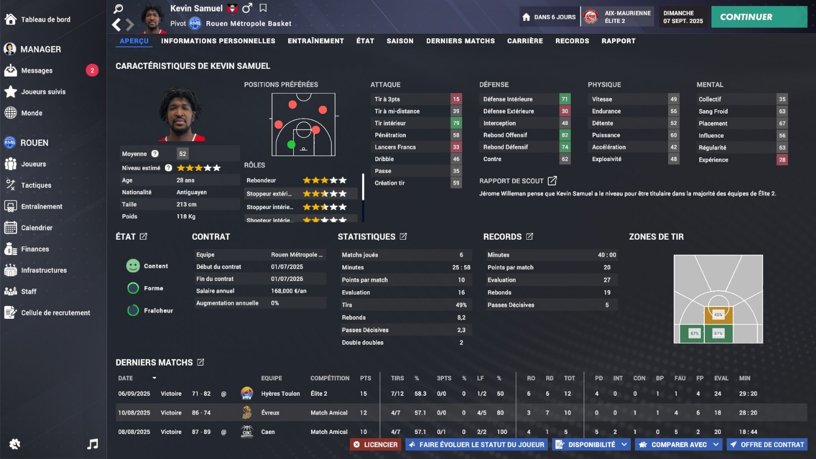 Kevin Samuel (2,13 m, 28 ans) incarne le rebondeur régulier par excellence dans Pro Basketball Manager 2026. Avec près de 7 rebonds de moyenne cette saison, il apporte de la constance et de la robustesse à votre raquette. Son profil est particulièrement intéressant pour les coaches cherchant un intérieur fiable, capable d’encaisser les minutes et de sécuriser le jeu intérieur face à des adversaires physiques.