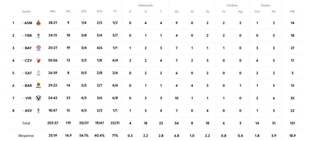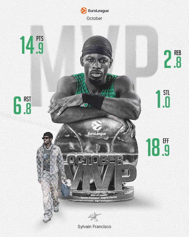Sous ses ordres, le Zalgiris Kaunas a enchaîné les victoires de prestige face à Monaco, contre le Fenerbahce ou Barcelone. Il a aussi battu de 37 points l’ASVEL. Sylvain Francisco s’impose comme le véritable chef d’orchestre d’une équipe redevenue redoutable sur la scène européenne. Ce trophée de MVP du mois vient saluer sa progression constante et confirme qu’il fait désormais partie des meilleurs meneurs de l’EuroLeague.