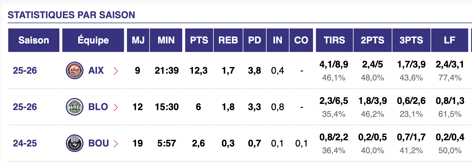 Une confirmation, surtout, de la nouvelle dimension qu’est en train de prendre le joueur sur les rives du lac du Bourget. Anonyme dans la rotation boulazacoise l’an dernier, où il n’avait certes pas été aidé par sa très grave entorse de la cheville pour démarrer la saison, il a plus que doublé sa moyenne offensive par rapport à sa pige blésoise à l’automne (de 6 à 12,3 points de moyenne), bien plus en confiance offensivement (de 23 à 44% à 3-points) et plus responsabilisé (de 16 à 22 minutes).
