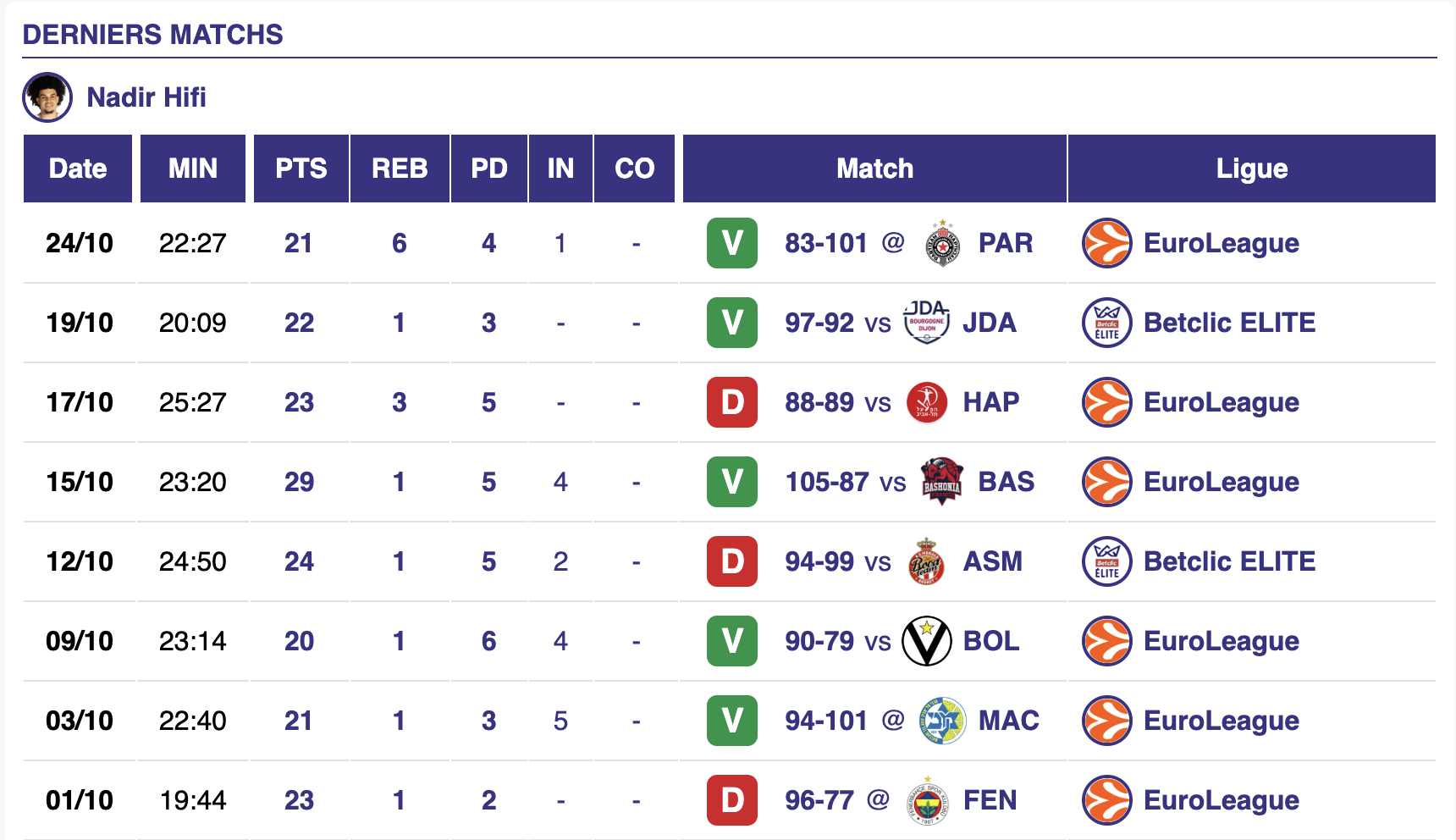 Désormais leader incontesté de l’équipe de la capitale, Nadir Hifi est lancé dans une invraisemblable série. L’enfant d’Illkirch-Graffenstaden n’est plus descendu sous la barre des 20 points depuis la première journée de Betclic ÉLITE et reste sur huit sorties d’affilée à 20 unités, ou plus. Le tout sans jamais avoir dépassé les 25 minutes de jeu ! Avant la passe de neuf ce dimanche à Chalon-sur-Saône ?