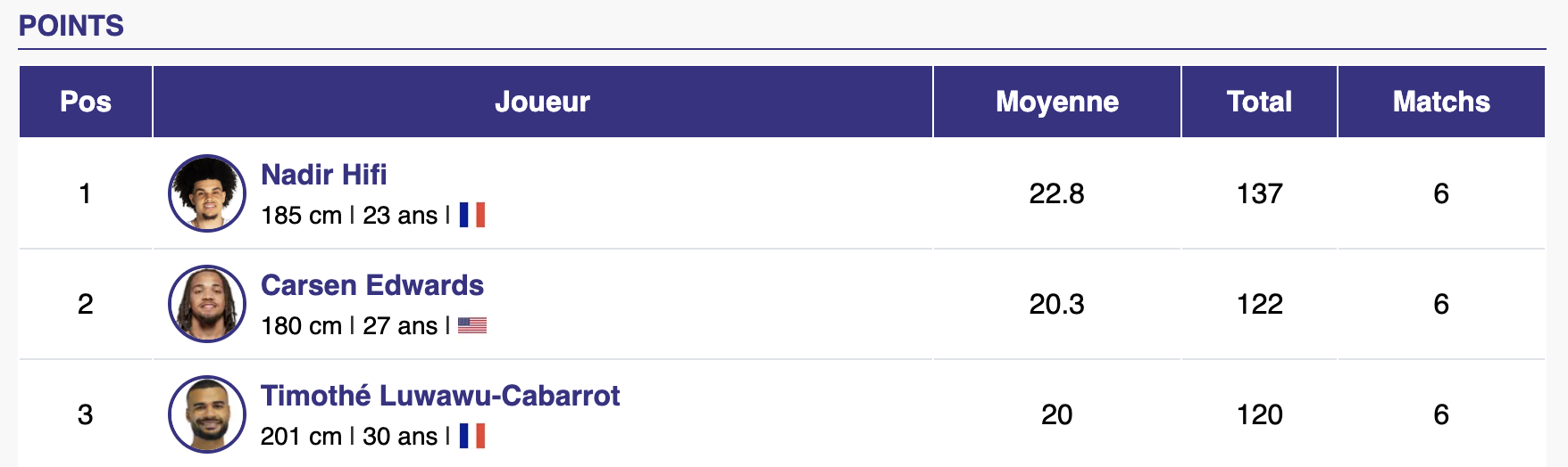 Plus que jamais, Nadir Hifi est le meilleur scoreur de l’EuroLeague (22,8 points par match). En six matchs, l’ancien pensionnaire de Nationale 3 (avec la réserve de la SIG Strasbourg) compte déjà 15 points de plus que son premier poursuivant, Carsen Edwards, et 17 que le troisième, son coéquipier chez les Bleus, Timothé Luwawu-Cabarrot.