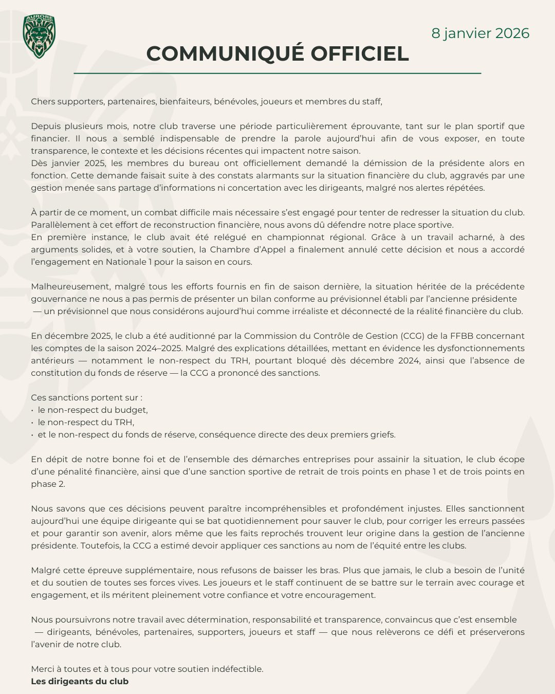 Après une audition organisée en décembre 2025, la Commission de Contrôle de Gestion (CCG) de la FFBB a confirmé la double pénalité : retrait de points et amende, motivés par le non-respect du budget, du tableau des ressources humaines, et du fonds de réserve obligatoire.